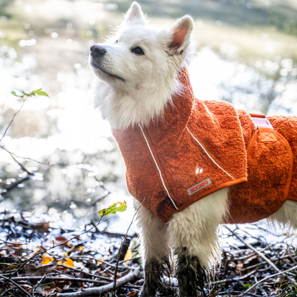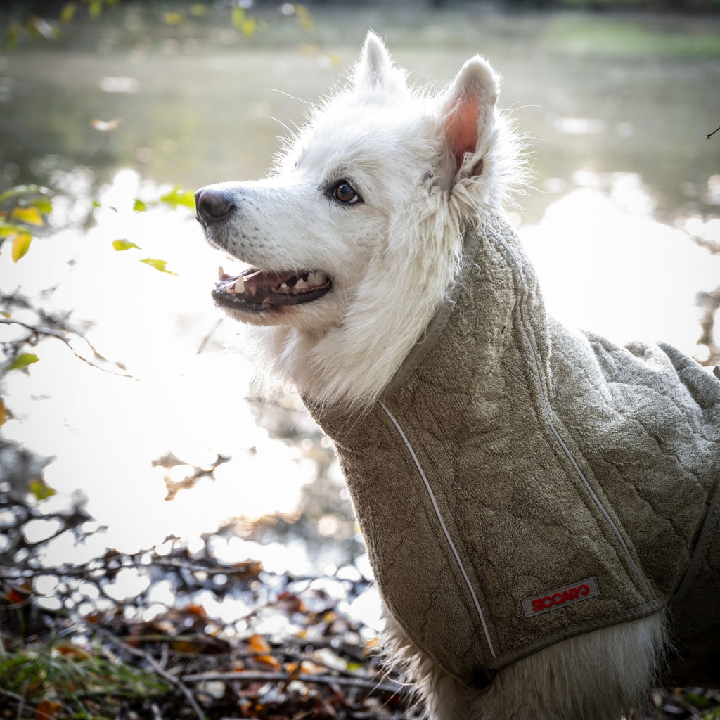 OBS: Lämna aldrig din hund utan uppsikt i ett torktäcke nära havet/sjön, eftersom dräkten kan suga upp så mycket vatten att hunden kan komma i fara om den går i vattnet med täcket på.